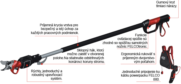 Nový predlžujúci nástavec FELCO 880/100 je kompatibilný so všetkými tromi modelmi elektrických nožníc FELCO - FELCO 802, FELCO 812 a FELCO 822 (aj s modelmi 801, 811, 820). Nevyhnutné príslušenstvo pre prácu v sadoch, v teréne, v parkoch, záhradách a záhradných centrách. Príjemná krycia vrstva pre bezpečný a istý úchop za každých pracovných podmienok. Sklopný hák, ktorý možno zaistiť v otvorenej polohe slúži k stiahnutiu odstrihnutých konárov z koruny stromu. Jednoduché pripojenie ku káblu Powerpacku FELCO 880. Rýchly, jednoduchý a robustný upevňovací systém pre uchytenie nožníc. Funkcia ovládacej spúšte je zhodná so spúšťou Rýchle a jednoduché upevnenie samotných nožníc FELCOtronic.