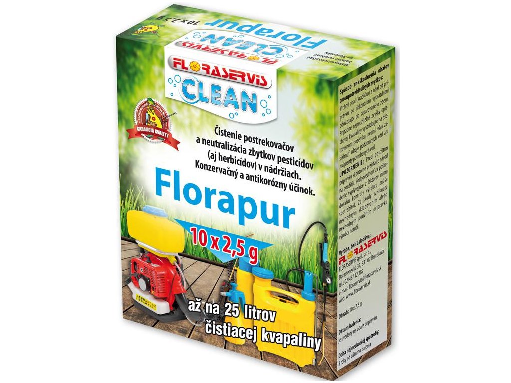 Florapur má výhodu oproti klasickému vypláchnutiu postrekovača s vodou, že zbytky predchádzajúceho postreku nielen vyčistí, ale aj zneutralizuje.Prázdny postrekovač vypláchnite vodou, potom naplnte roztokom prípravku podľa návodu na obale, určitú časť vystriekajte, aby ste vyčistili všetky časti postrekovača.
