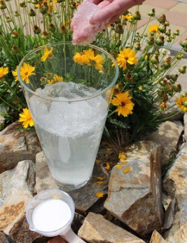 3, Po pár minútach hydrogel na seba naviazal celé 2l vody 4, Hydrogel zabezpečí to, že voda sa z pôdy neodplaví, ale zostáva tam vo forme gélu