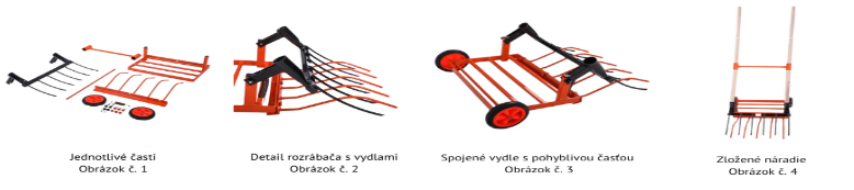 Náradie je zložené z hlavných častí: vidly, pohyblivá časť, predné zakončenie, plastové koliesko 2 x, pružina, spojovací držiak na drevené násady, kovová tyč, kovový výsuvný kryt, skrutka do dreva 2x (Obrázok č. 1). Najprv nasadíme drevené násady do vidly a dobre upevníme skrutky do dreva, ktoré sú súčasťou balenie. Potom spojíme pohyblivú časť (vložíme kovovú tyč a na každej strane namontujeme koleso a rozrábač pomocou dvoch skrutiek a matíc 10x20mm, nakoniec spojíme vidly a pohyblivú časť rovnako dvomi skrutkami 10x40 mm (Obrázok č. 2 a 3). Poskladaný nástroj (Obrázok č. 4).