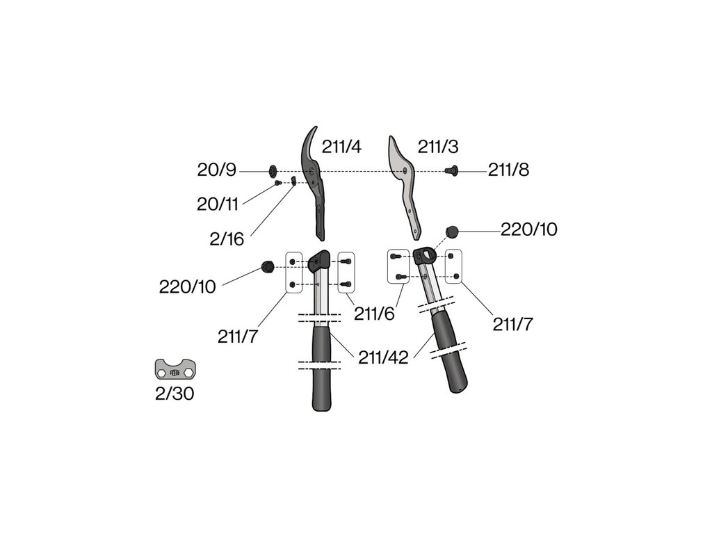 Model obojručných nožníc FELCO 211 disponuje novou a obzvlášť výkonnou strihacou hlavicou s veľkým ostrím rádiusovým tvarom a kovaným protiostrím s výrazným zakrivením. Vďaka tejto novej geometrii je vetva pri strihu usadená bližšie k stredovej osi hlavice, prienik ostria drevom je tak ľahší a výsledkom je čistý a precízny rez. S priemerom strihu do 35 mm sú perfektným nástrojom pre strih tvrdých drevín.