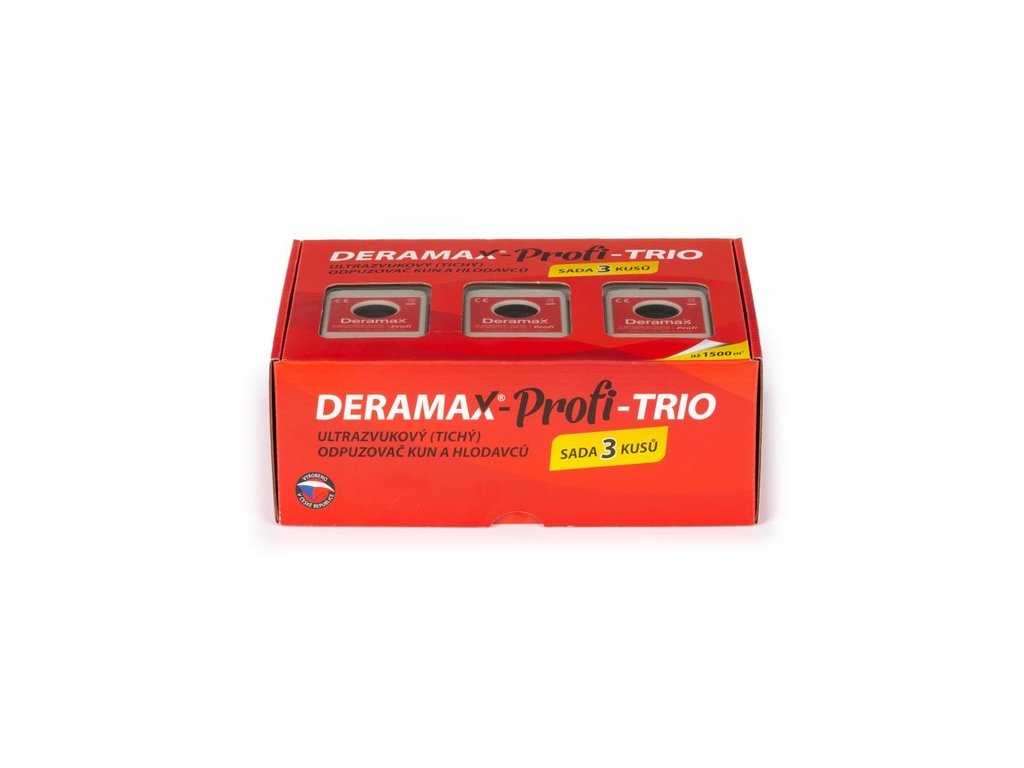 Sada Deramax-Profi-Trio obsahuje 3 ks špičkových ultrazvukových plašič (repelentov) kún a hlodavcov Deramax-Profi + príslušenstvo. Jedná sa o novú verziu produktu s novým dizajnom, rozšíreným uhlom záberu a vyššou odolnosťou voči vode. Tieto odpudzovače vykazujú vysoký výkon a bezpečnú prevádzku za skvelú cenu. Ide o český produkt. Sada Plašič Deramax-Profi-Trio zaistí komplexnú ochranu celého rodinného domu (napr. pivnica + prízemie + podkrovie). Ak využijete celú sadu iba pre jedno podlažie, významne sa zvýši efekt proti škodcom oproti využitiu jedného plašiča.