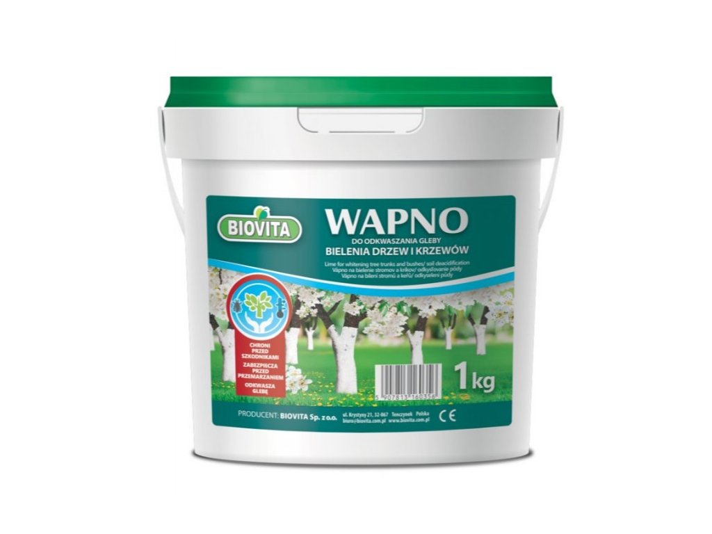 Na ochranu kmeňov ovocných stromov na vašom pozemku môžete použiť bieliace vápno Biovita. Prípravok vytvára ochrannú bariéru, ktorá škodcom sťažuje prístup do vnútra kmeňa stromov a kríkov. Prípravok odporúčame používať v období od októbra do apríla, pretože práve v tomto období sú rastliny najviac vystavené poškodeniu. Práškové vápno na rozrobenie vo vode na bielenie kmeňov stromov a kríkov, prípadne aj na povápnenie pôdy. Chemický vzorec CaO. Zmes sa pri miešaní s vodou mierne zahreje. Vápno po natretí chráni strom proti roztrhnutiu kmeňov zdola nahor počas snehovej pokrývky, kedy dochádza na neobielených kmeňoch k veľkým teplotným rozdielom pri slnečnom dni (z juhu teplo, zo severu mráz), Náter bielym vápnom pomáha čiastočne aj proti škodcom, sťažuje prístup do vnútra kmeňa rastlín, kríkov a stromov. Prípravok odporúčame používať v období od októbra do apríla, pretože práve v tomto období sú rastliny najviac vystavené poškodeniu.